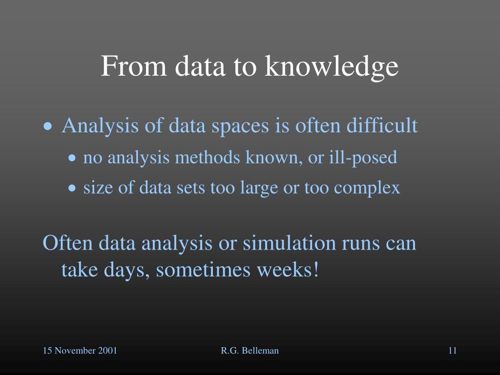 From data to knowledge • Analysis of data spaces is often difficult • no analysis methods known, or ill-posed • size of data sets too large or too complex Often data analysis or simulation runs can take days, sometimes weeks! R.G. Belleman