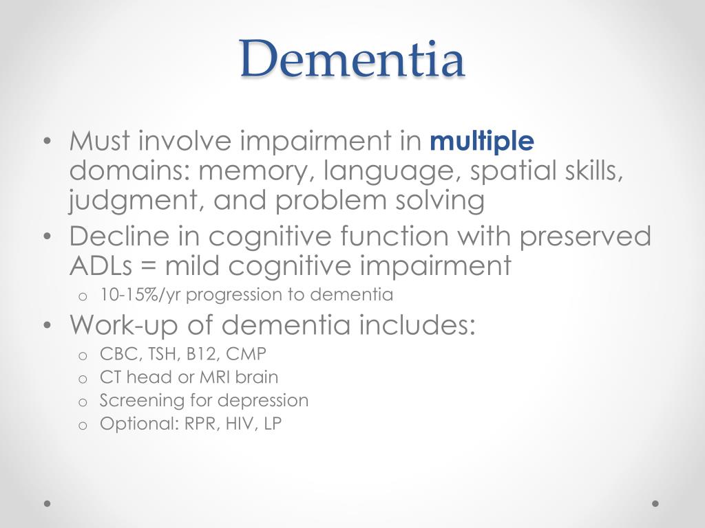 Dementia • Must involve impairment in multiple domains: memory, language, spatial skills, judgment, and problem solving • Decline in cognitive function with preserved ADLs = mild cognitive impairment • 10-15%/yr progression to dementia • Work-up of dementia includes: • CBC, TSH, B12, CMP • CT head or MRI brain • Screening for depression • Optional: RPR, HIV, LP