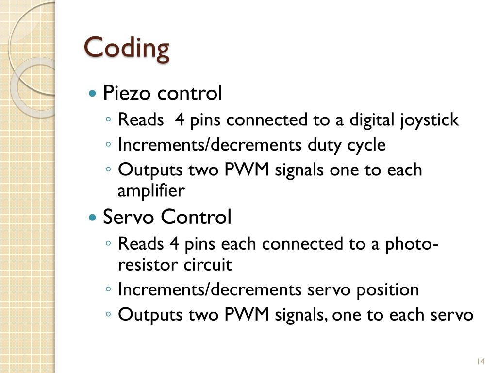 Coding • Piezo control • Reads 4 pins connected to a digital joystick • Increments/decrements duty cycle • Outputs two PWM signals one to each amplifier • Servo Control • Reads 4 pins each connected to a photo-resistor circuit • Increments/decrements servo position • Outputs two PWM signals, one to each servo