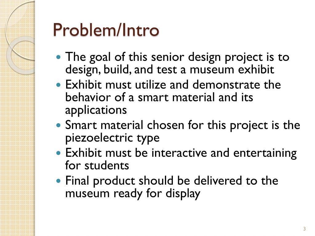 Problem/Intro • The goal of this senior design project is to design, build, and test a museum exhibit • Exhibit must utilize and demonstrate the behavior of a smart material and its applications • Smart material chosen for this project is the piezoelectric type • Exhibit must be interactive and entertaining for students • Final product should be delivered to the museum ready for display