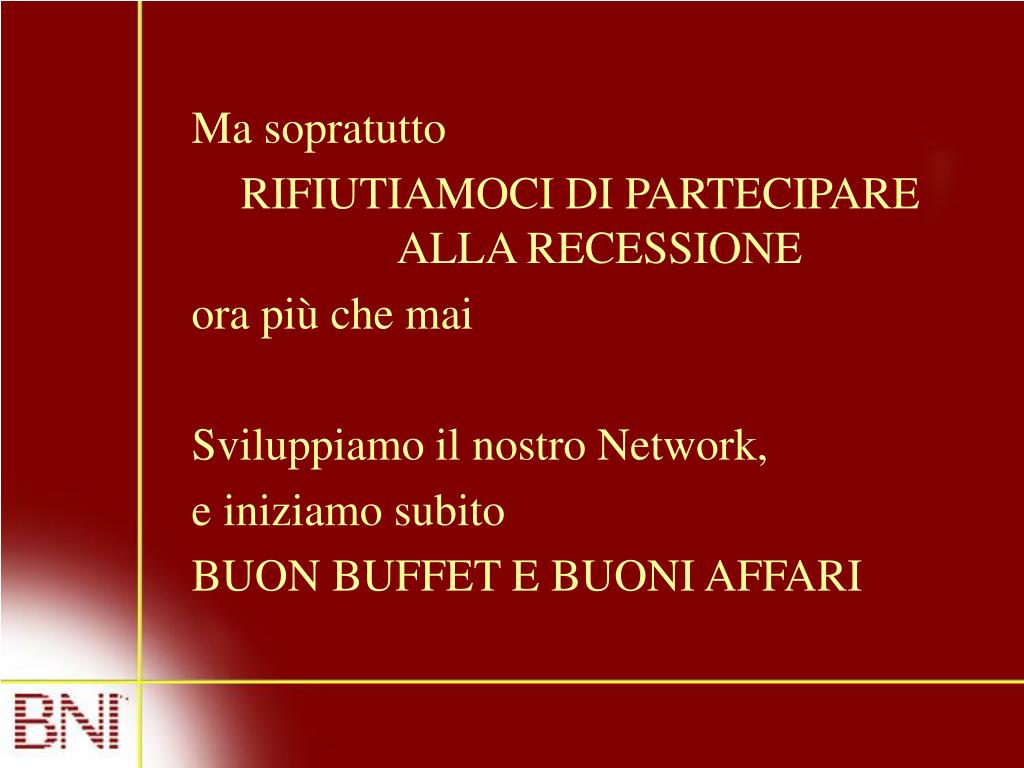 Ma sopratutto • RIFIUTIAMOCI DI PARTECIPARE ALLA RECESSIONE • ora più che mai • Sviluppiamo il nostro Network, • e iniziamo subito • BUON BUFFET E BUONI AFFARI