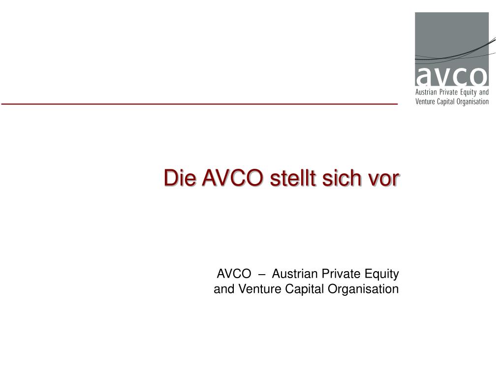 Die AVCO stellt sich vor. AVCO – Austrian Private Equity and Venture Capital Organisation. Was ist die AVCO?. Die AVCO – Austrian Private Equity und Venture Capital Organisation . Ist als Verein organisiert.