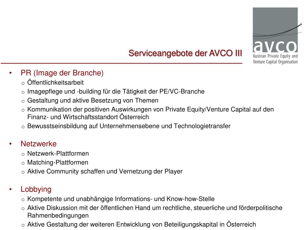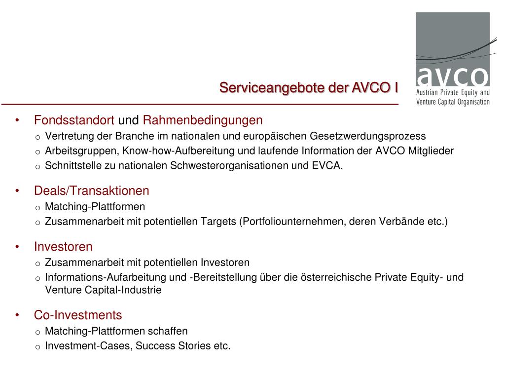 Serviceleistungen für die Mitglieder Informations- und Know-how-Bereitstellung, um Awareness zu erhöhen und Funktionen von PE zu verdeutlichen Networking, um Zusammenarbeit innerhalb der Branche und mit interessierten Akteuren zu forcieren Interessensvertretung, um Rahmenbedingungen zu verbessern Zusammenarbeit mit EVCA, NVCAs, EK etc., um internationale Einbindung zu verstärken Ziele und Aufgaben der AVCO?