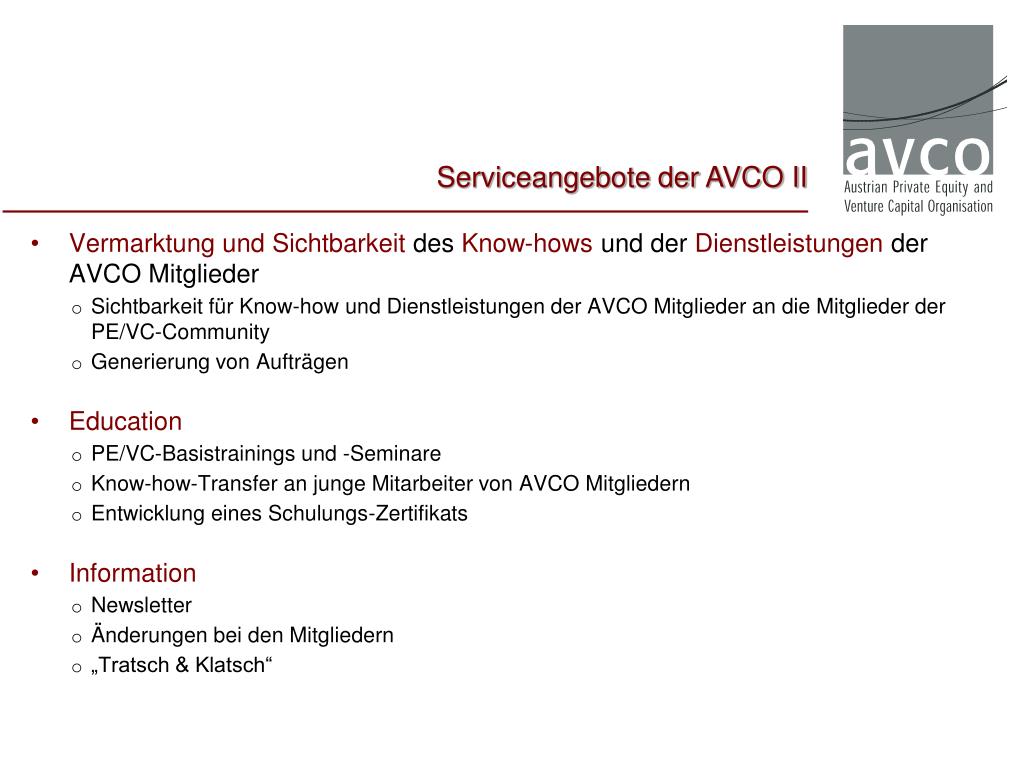 Vermarktung und Sichtbarkeit des Know-hows und der Dienstleistungen der AVCO Mitglieder Sichtbarkeit für Know-how und Dienstleistungen der AVCO Mitglieder an die Mitglieder der PE/VC-Community Generierung von Aufträgen Education PE/VC-Basistrainingsund -Seminare Know-how-Transfer an junge Mitarbeiter von AVCO Mitgliedern Entwicklung eines Schulungs-Zertifikats Information Newsletter Änderungen bei den Mitgliedern „Tratsch & Klatsch“ Serviceangebote der AVCO II