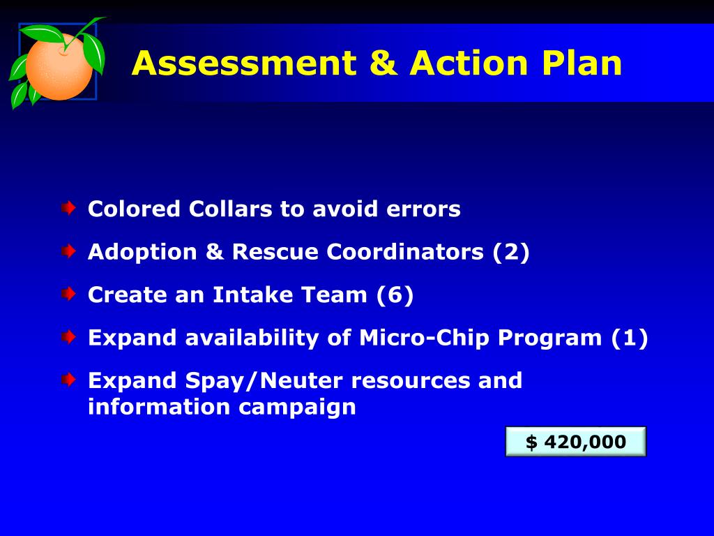 Assessment & Action Plan • Colored Collars to avoid errors • Adoption & Rescue Coordinators (2) • Create an Intake Team (6) • Expand availability of Micro-Chip Program (1) • Expand Spay/Neuter resources and information campaign $ 420,000