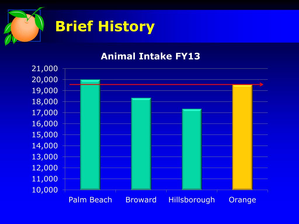 Brief Overview • Orange County’s only “Open Admission” Shelter • No animals are turned away • FY 2013: • 19,679 Impoundments • 7,665 Spay/Neuter Surgeries • 44,232 Field Calls handled