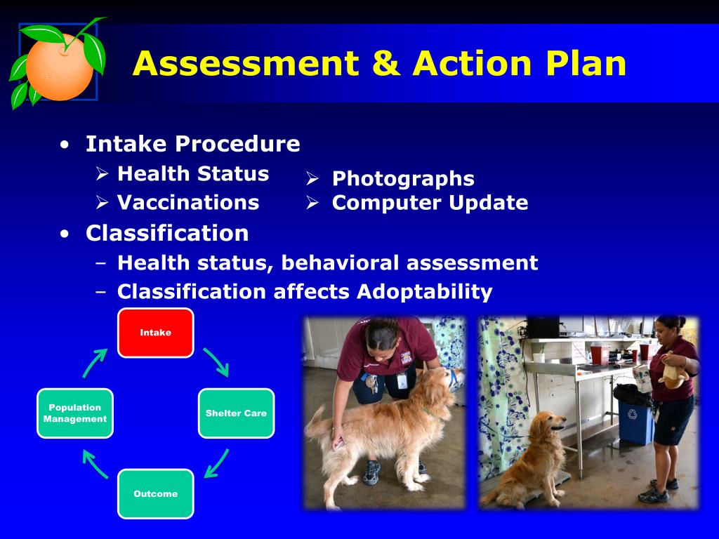 Assessment & Action Plan • Intake Procedure • Health Status • Vaccinations • Classification • Health status, behavioral assessment • Classification affects Adoptability • Photographs • Computer Update