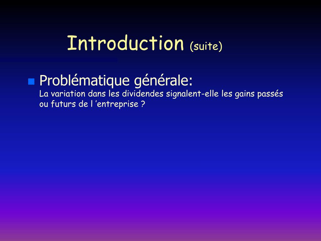 Introduction (suite) • Problématique générale: La variation dans les dividendes signalent-elle les gains passés ou futurs de l ’entreprise ?