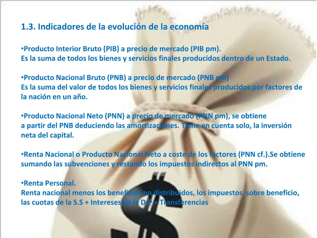 1.3. Indicadores de la evolución de la economía • Producto Interior Bruto (PIB) a precio de mercado (PIB pm). • Es la suma de todos los bienes y servicios finales producidos dentro de un Estado. • Producto Nacional Bruto (PNB) a precio de mercado (PNB pm) • Es la suma del valor de todos los bienes y servicios finales producidos por factores de la nación en un año. • Producto Nacional Neto (PNN) a precio de mercado (PNN pm), se obtiene • apartir del PNB deduciendolas amortizaciones. Tiene en cuenta solo, la inversión neta del capital. • Renta Nacional o Producto Nacional Neto a costede los factores (PNN cf.).Se obtiene • sumando las subvenciones y restando los impuestos indirectos al PNN pm. • Renta Personal. • Renta nacional menos los beneficios no distribuidos,los impuestos sobre beneficio, las cuotas de la S.S + Intereses de la D.P + Transferencias