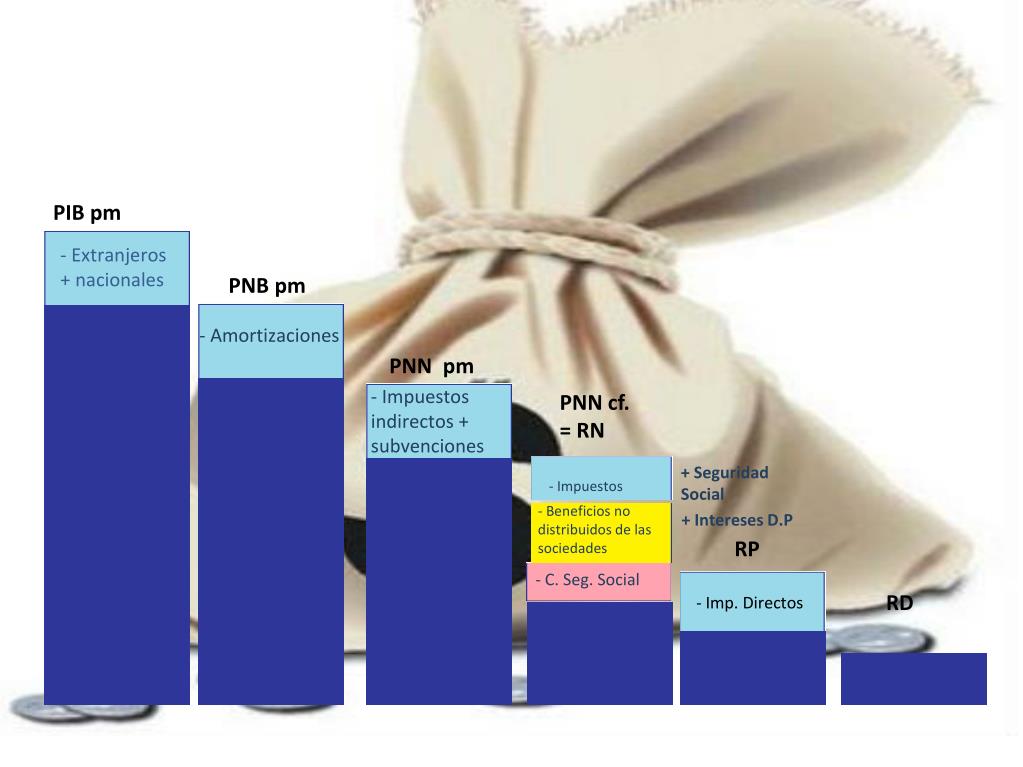 PIB pm • Extranjeros • + nacionales PNB pm - Amortizaciones PNN pm - Impuestos indirectos + subvenciones PNN cf. = RN + Seguridad Social - Impuestos - Beneficios no distribuidos de las sociedades + Intereses D.P RP - C. Seg. Social RD - Imp. Directos