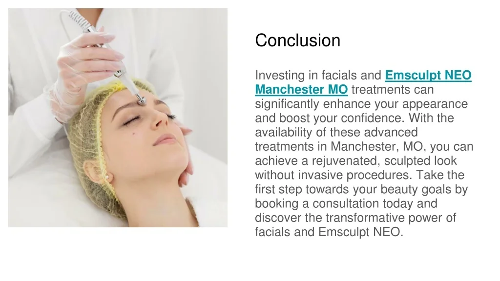 Conclusion Investing in facials and Emsculpt NEO Manchester MO treatments can significantly enhance your appearance and boost your confidence. With the availability of these advanced treatments in Manchester, MO, you can achieve a rejuvenated, sculpted look without invasive procedures. Take the first step towards your beauty goals by booking a consultation today and discover the transformative power of facials and Emsculpt NEO.