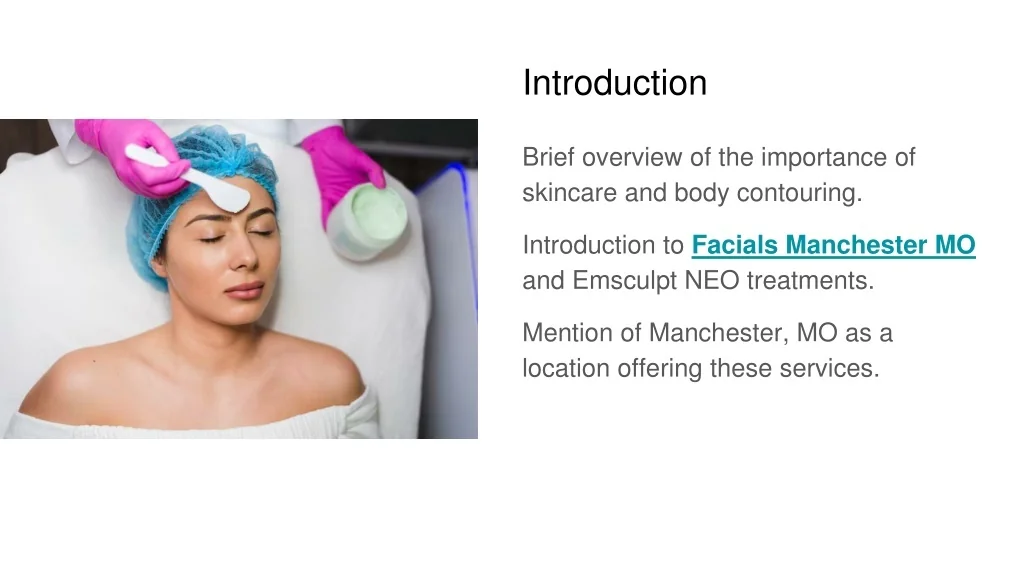 Introduction Brief overview of the importance of skincare and body contouring. Introduction to Facials Manchester MO and Emsculpt NEO treatments. Mention of Manchester, MO as a location offering these services.