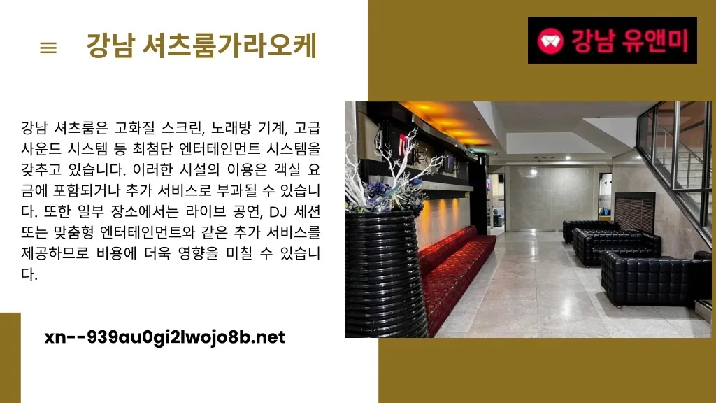 강남셔츠룸가라오케 강남셔츠룸은고화질스크린, 노래방기계, 고급 사운드시스템등최첨단엔터테인먼트시스템을 갖추고있습니다. 이러한시설의이용은객실요 금에포함되거나추가서비스로부과될수있습니 다. 또한일부장소에서는라이브공연, DJ 세션 또는맞춤형엔터테인먼트와같은추가서비스를 제공하므로비용에더욱영향을미칠수있습니 다. xn--939au0gi2lwojo8b.net