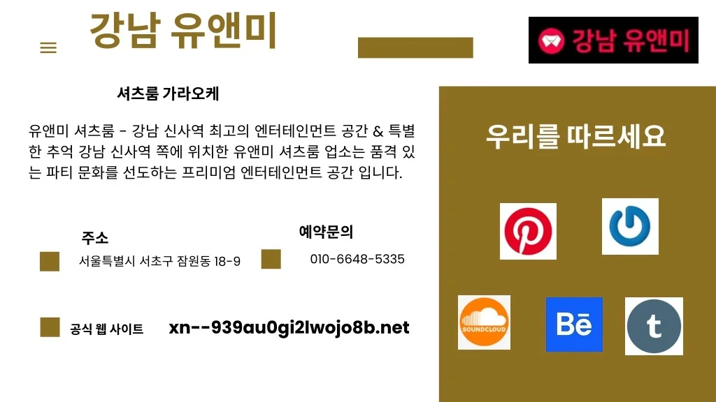 강남유앤미 셔츠룸가라오케 우리를따르세요 유앤미셔츠룸 - 강남신사역최고의엔터테인먼트공간 & 특별 한추억강남신사역쪽에위치한유앤미셔츠룸업소는품격있 는파티문화를선도하는프리미엄엔터테인먼트공간입니다. 예약문의 주소 서울특별시서초구잠원동 18-9 010-6648-5335 xn--939au0gi2lwojo8b.net 공식웹사이트