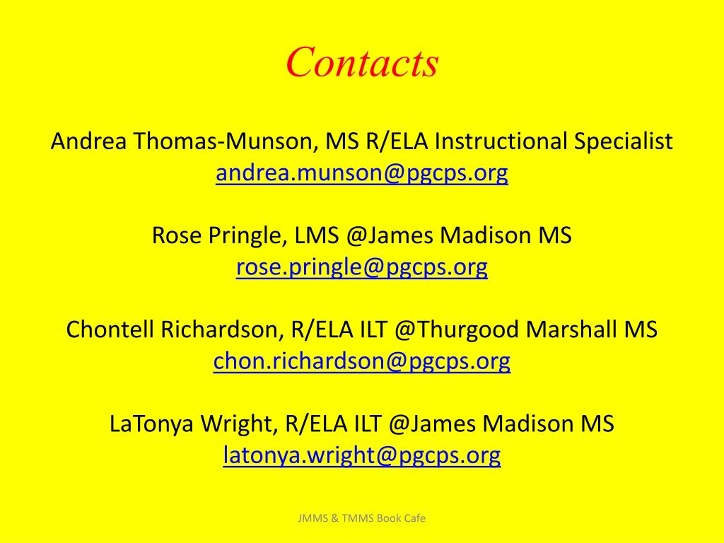 Contacts Andrea Thomas-Munson, MS R/ELA Instructional Specialist andrea.munson@pgcps.org Rose Pringle, LMS @James Madison MS rose.pringle@pgcps.org Chontell Richardson, R/ELA ILT @Thurgood Marshall MS chon.richardson@pgcps.org LaTonya Wright, R/ELA ILT @James Madison MS latonya.wright@pgcps.org JMMS & TMMS Book Cafe