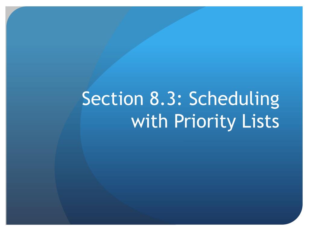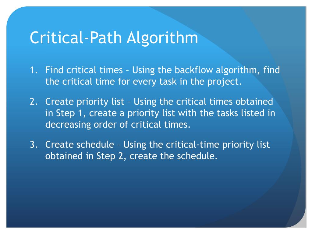 Critical-Path Algorithm • Find critical times – Using the backflow algorithm, find the critical time for every task in the project. • Create priority list – Using the critical times obtained in Step 1, create a priority list with the tasks listed in decreasing order of critical times. • Create schedule – Using the critical-time priority list obtained in Step 2, create the schedule.