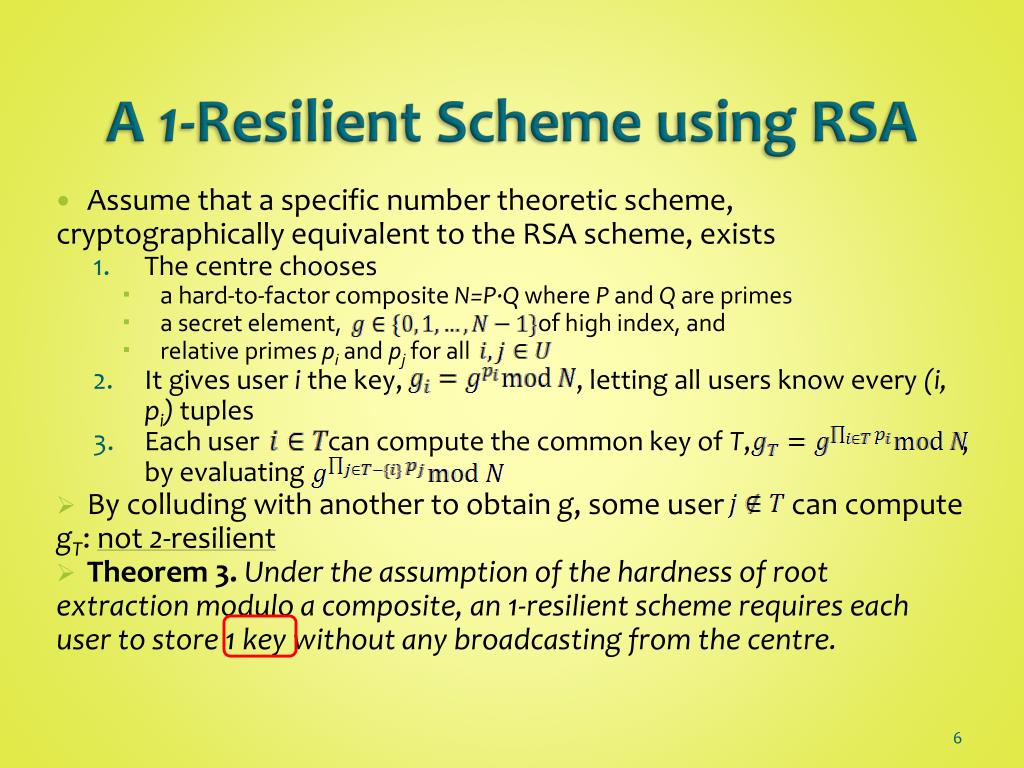 A 1-Resilient Scheme using RSA • Assume that a specific number theoretic scheme, cryptographically equivalent to the RSA scheme, exists • The centre chooses • a hard-to-factor composite N=P∙Q where P and Q are primes • a secret element, of high index, and • relative primes pi and pj for all • It gives user i the key, , letting all users know every (i, pi) tuples • Each user can compute the common key of T, , by evaluating • By colluding with another to obtain g, some user can compute gT: not 2-resilient • Theorem 3.Under the assumption of the hardness of root extraction modulo a composite, an 1-resilient scheme requires each user to store 1 key without any broadcasting from the centre.