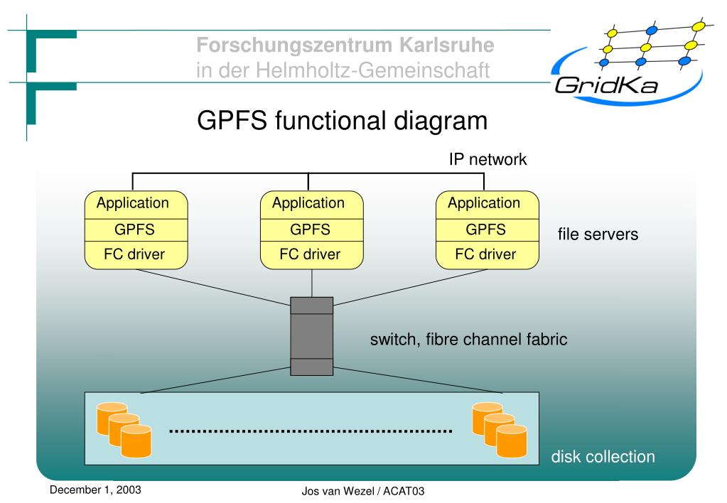 Application Application Application GPFS GPFS GPFS FC driver FC driver FC driver disk collection GPFS functional diagram IP network file servers switch, fibre channel fabric Jos van Wezel / ACAT03