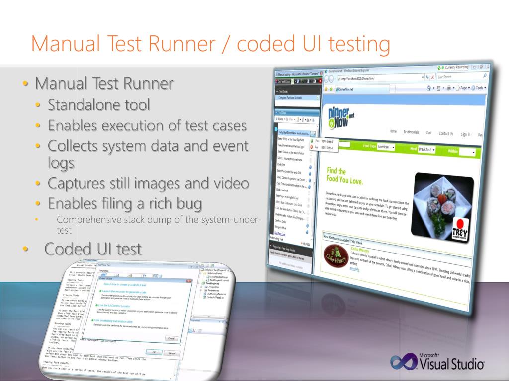Manual Test Runner Standalone tool Enables execution of test cases Collects system data and event logs Captures still images and video Enables filing a rich bug Comprehensive stack dump of the system-under-test Coded UI test Manual Test Runner / coded UI testing