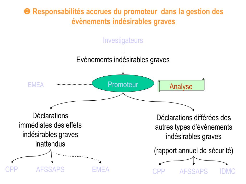 Responsabilités accrues du promoteur dans la gestion des évènements indésirables graves Investigateurs Evènements indésirables graves Promoteur EMEA Analyse Déclarations immédiates des effets indésirables graves inattendus Déclarations différées des autres types d’évènements indésirables graves (rapport annuel de sécurité) CPP AFSSAPS EMEA IDMC CPP AFSSAPS