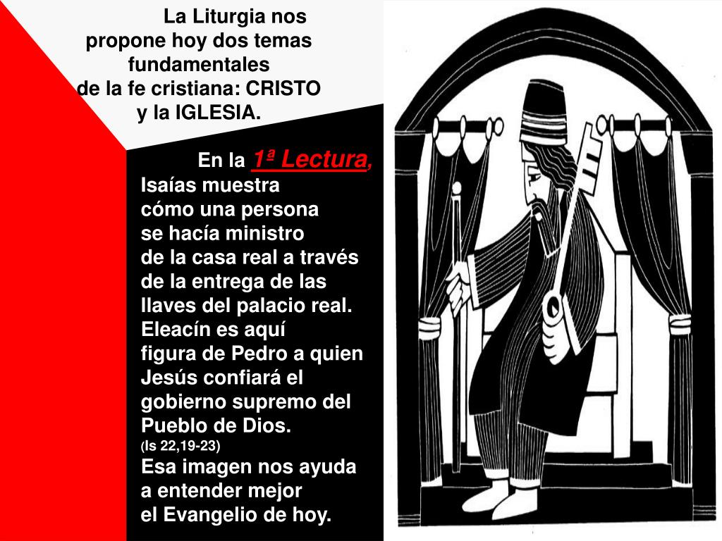 La Liturgia nos propone hoy dos temas fundamentales de la fe cristiana: CRISTO y la IGLESIA. En la 1ª Lectura, Isaías muestra cómo una persona se hacía ministro de la casa real a través de la entrega de las llaves del palacio real. Eleacín es aquí figura de Pedro a quien Jesús confiará el gobierno supremo del Pueblo de Dios. (Is 22,19-23) Esa imagen nos ayuda a entender mejor el Evangelio de hoy.
