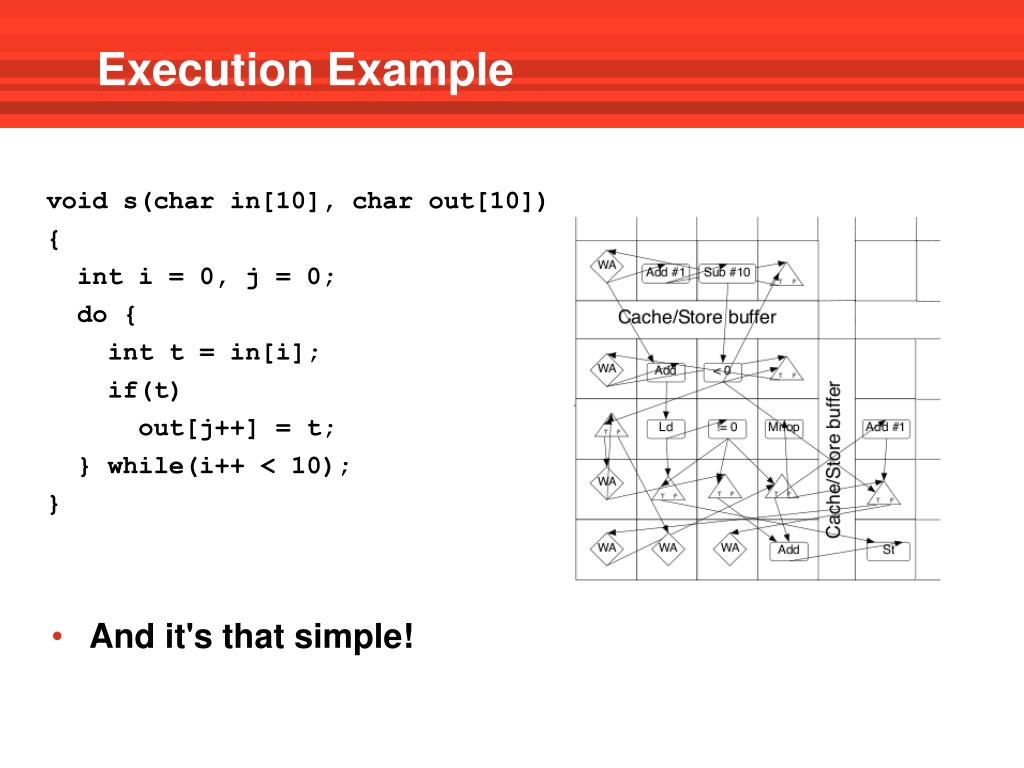 Execution Example void s(char in[10], char out[10]) { int i = 0, j = 0; do { int t = in[i]; if(t) out[j++] = t; } while(i++ < 10); } • And it's that simple!