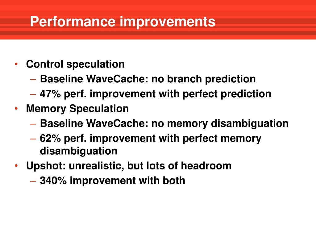 Performance improvements • Control speculation • Baseline WaveCache: no branch prediction • 47% perf. improvement with perfect prediction • Memory Speculation • Baseline WaveCache: no memory disambiguation • 62% perf. improvement with perfect memory disambiguation • Upshot: unrealistic, but lots of headroom • 340% improvement with both