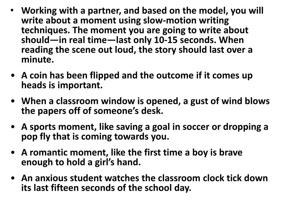 Working with a partner, and based on the model, you will write about a moment using slow-motion writing techniques. The moment you are going to write about should—in real time—last only 10-15 seconds. When reading the scene out loud, the story should last over a minute. • A coin has been flipped and the outcome if it comes up heads is important. • When a classroom window is opened, a gust of wind blows the papers off of someone’s desk. • A sports moment, like saving a goal in soccer or dropping a pop fly that is coming towards you. • A romantic moment, like the first time a boy is brave enough to hold a girl’s hand. • An anxious student watches the classroom clock tick down its last fifteen seconds of the school day.