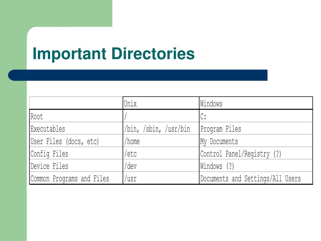 UNIX File Structure • Files treated as a hierarchy • Absolute paths begin at root (/) and access the same location regardless of current directory • Relative paths begin in the current directory