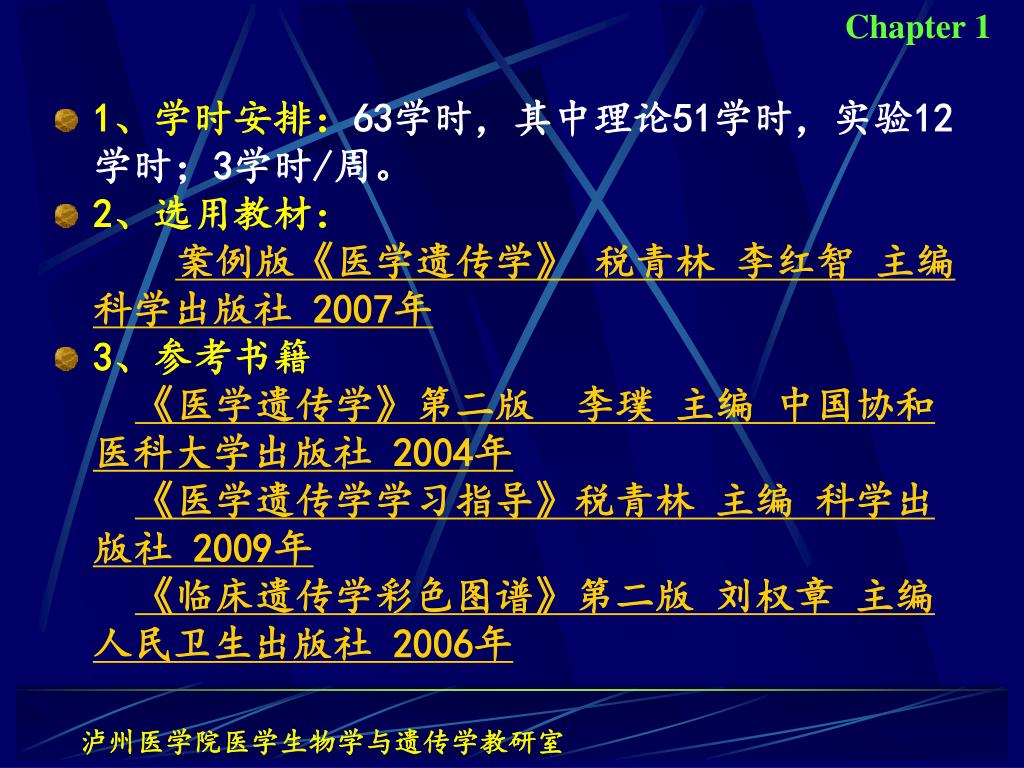 医 学 遗 传 学 Medical Genetics. 泸州医学院生物学与遗传学教研室. 1 、学时安排: 63 学时,其中理论 51 学时,实验 12 学时; 3 学时 / 周。 2 、选用教材: 案例版 《 医学遗传学 》 税青林 李红智 主编 科学出版社 2007 年 3 、参考书籍 《 医学遗传学 》 第二版 李璞 主编 中国协和医科大学出版社 2004 年 《 医学遗传学学习指导 》 税青林 主编 科学出版社 2009 年 《 临床遗传学彩色图谱 》 第二版 刘权章 主编 人民卫生出版社 2006 年. 4 、医学遗传学相关网站