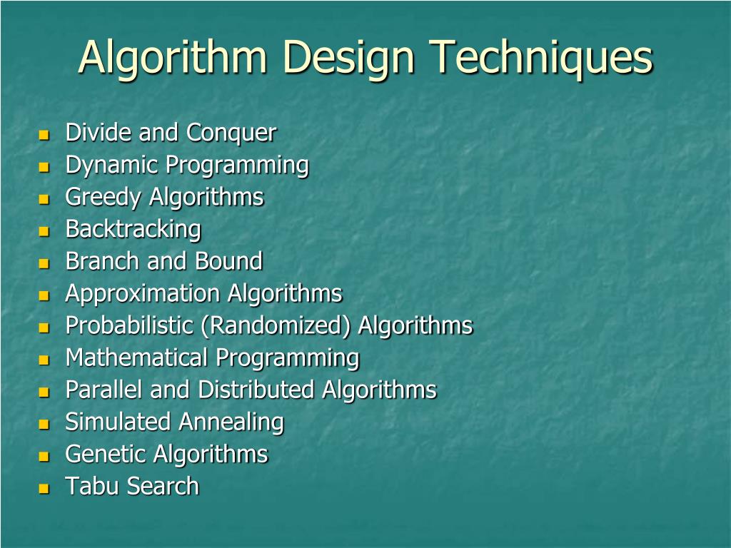 Algorithm Design Techniques • Divide and Conquer • Dynamic Programming • Greedy Algorithms • Backtracking • Branch and Bound • Approximation Algorithms • Probabilistic (Randomized) Algorithms • Mathematical Programming • Parallel and Distributed Algorithms • Simulated Annealing • Genetic Algorithms • Tabu Search