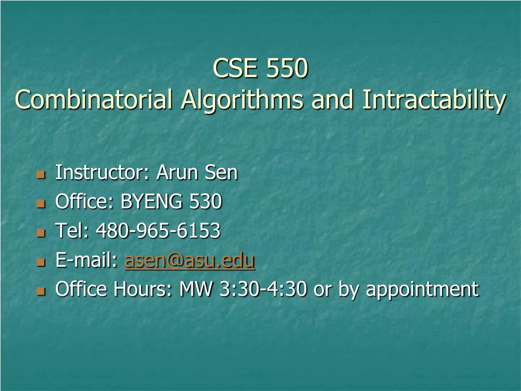 CSE 550Combinatorial Algorithms and Intractability • Instructor: Arun Sen • Office: BYENG 530 • Tel: 480-965-6153 • E-mail: asen@asu.edu • Office Hours: MW 3:30-4:30 or by appointment
