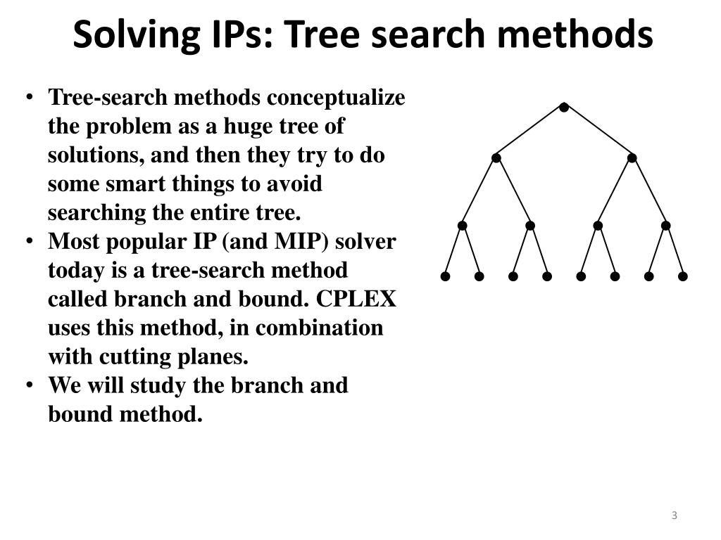 Tree-search methods conceptualize the problem as a huge tree of solutions, and then they try to do some smart things to avoid searching the entire tree. • Most popular IP (and MIP) solver today is a tree-search method called branch and bound. CPLEX uses this method, in combination with cutting planes. • We will study the branch and bound method. Solving IPs: Tree search methods