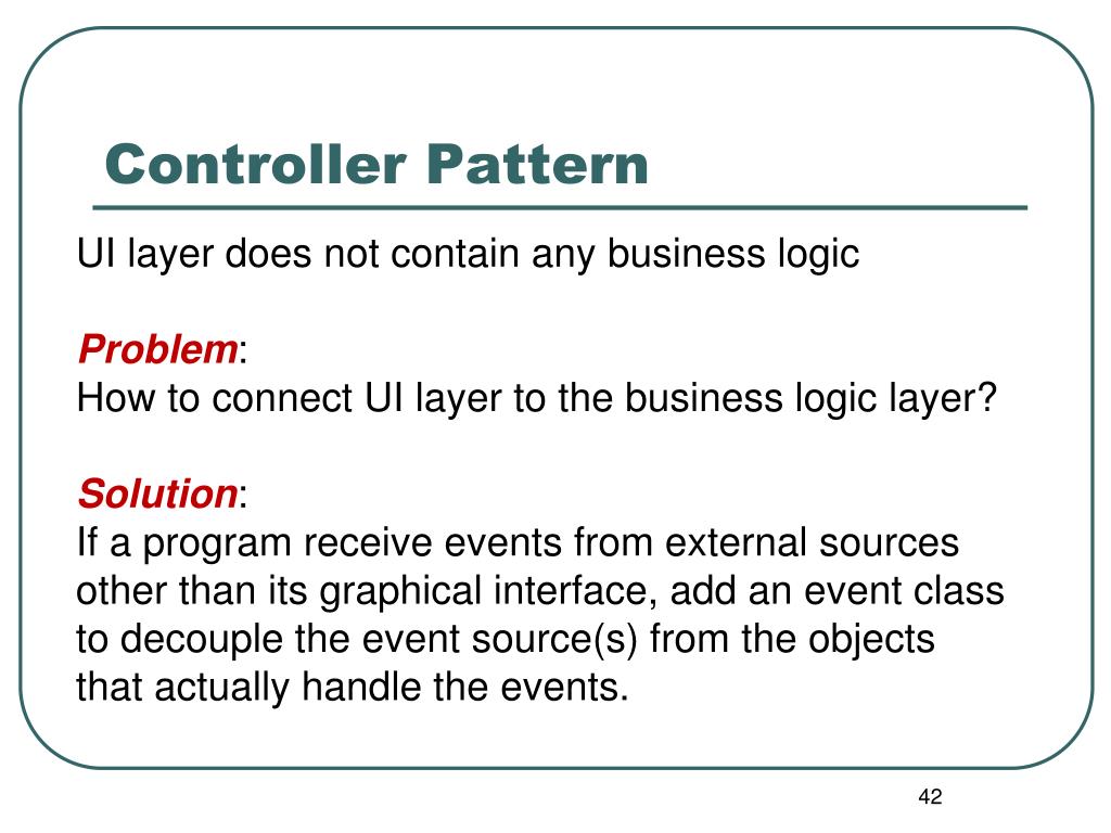 Controller Pattern UI layer does not contain any business logic Problem: How to connect UI layer to the business logic layer? Solution: If a program receive events from external sources other than its graphical interface, add an event class to decouple the event source(s) from the objects that actually handle the events.