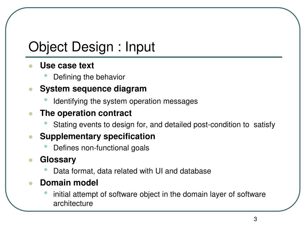 Object Design : Input • Use case text • Defining the behavior • Systemsequencediagram • Identifyingthe system operation messages • Theoperationcontract • Stating events to design for, and detailed post-condition to satisfy • Supplementaryspecification • Defines non-functional goals • Glossary • Data format, data related with UI and database • Domainmodel • initial attempt of software object in the domain layer of software architecture