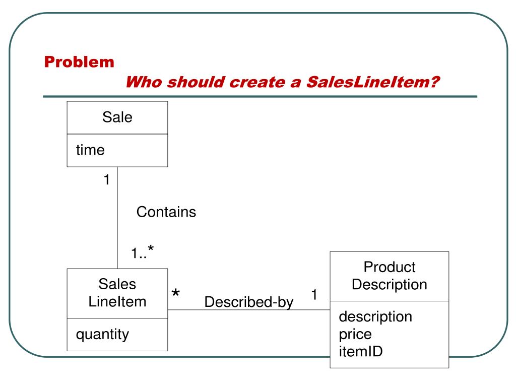 Creator principle B “hastheInitializing data for ” A that will be passed to A when it is created. • Often initiation is done using a constructor with parameters. e.g. a Payment instance, when created needs to be initialized with the Sale total. • Sale class knows Sale total. Good candidate for creating Payment is Sale. If more than one of the above applies, prefer a class B which aggregates or contains A.