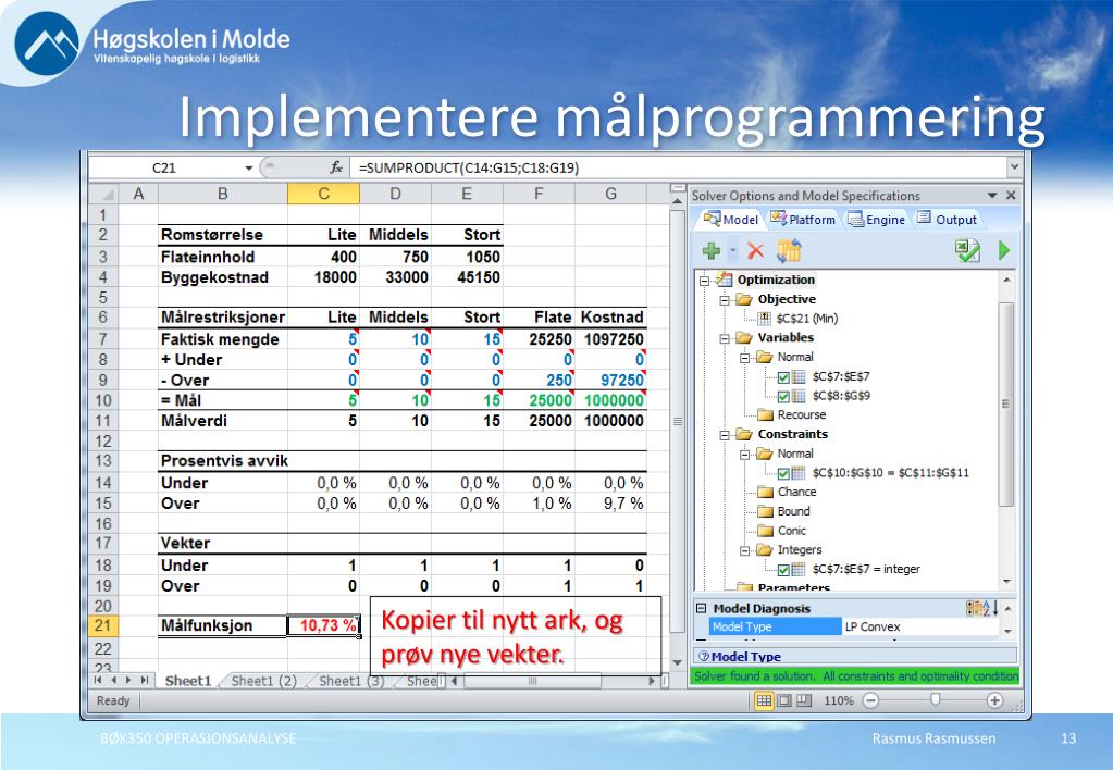 Implementere målprogrammering Kopier til nytt ark, og prøv nye vekter. BØK350 OPERASJONSANALYSE