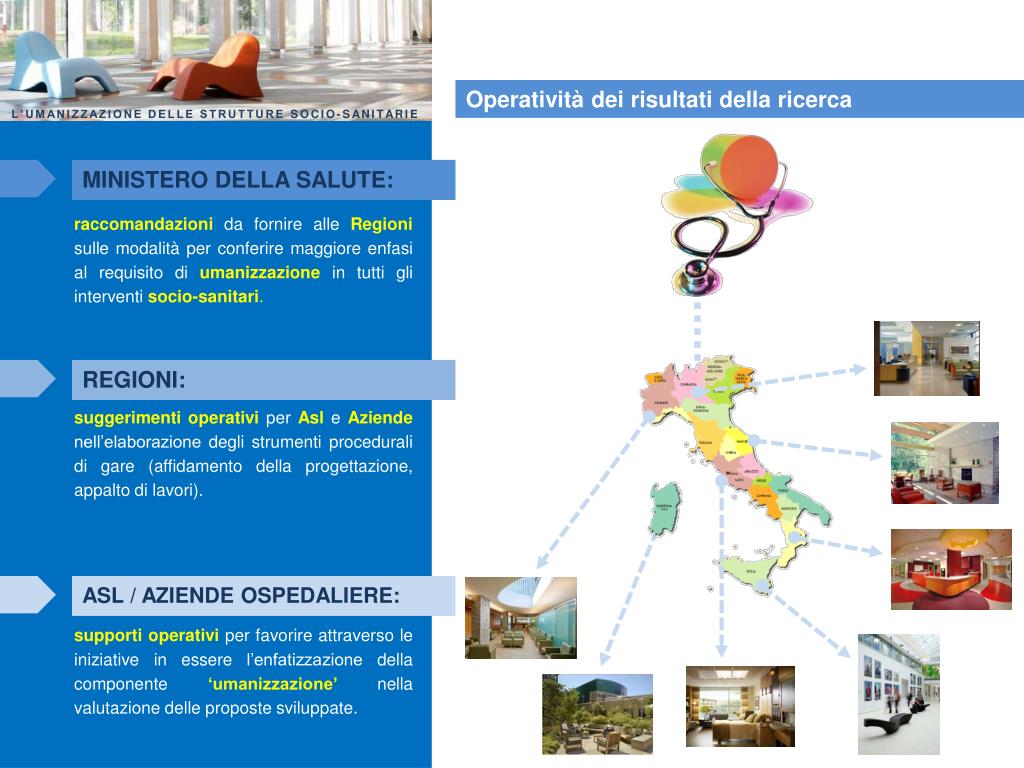 Operatività dei risultati della ricerca L’UMANIZZAZIONE DELLE STRUTTURE SOCIO-SANITARIE MINISTERO DELLA SALUTE: raccomandazionida fornire alle Regionisulle modalità per conferire maggiore enfasi al requisito di umanizzazionein tutti gli interventi socio-sanitari. REGIONI: suggerimenti operativi per Asl e Aziende nell’elaborazione degli strumenti procedurali di gare (affidamento della progettazione, appalto di lavori). ASL / AZIENDE OSPEDALIERE: supporti operativi per favorire attraverso le iniziative in essere l’enfatizzazione della componente ‘umanizzazione’ nella valutazione delle proposte sviluppate.