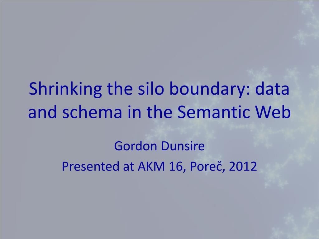 Shrinking the silo boundary: data and schema in the Semantic Web. Gordon Dunsire Presented at AKM 16, Poreč, 2012. Task: To publish local structured metadata as global linked data in the Semantic Web.