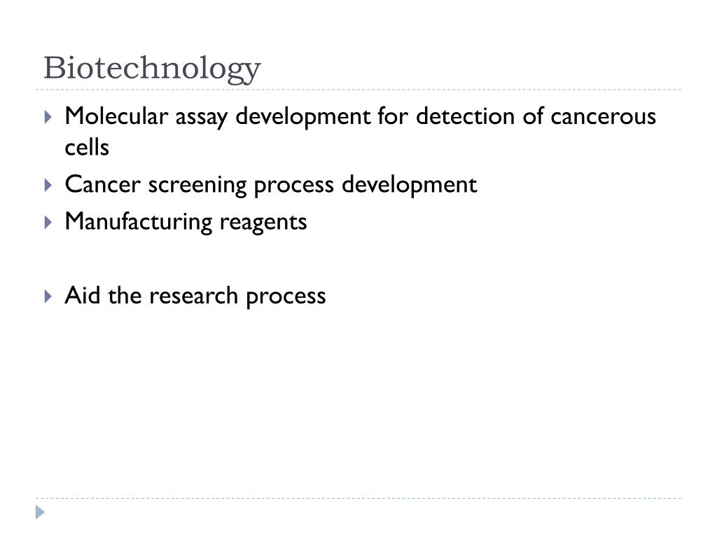 Biotechnology • Molecular assay development for detection of cancerous cells • Cancer screening process development • Manufacturing reagents • Aid the research process