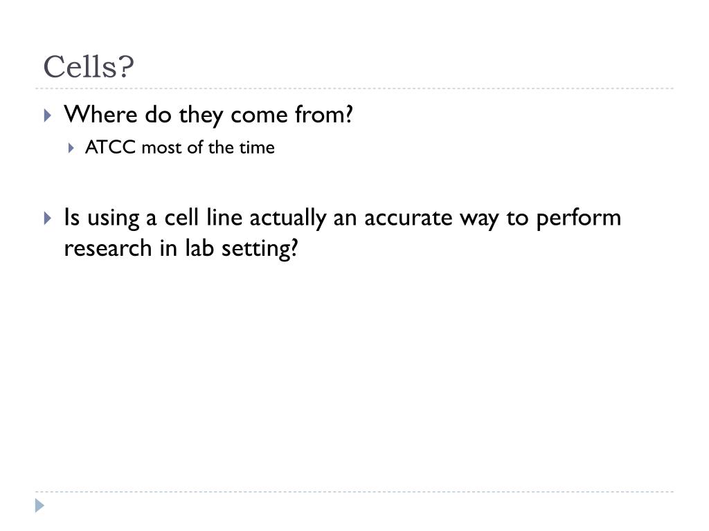 Cells? • Where do they come from? • ATCC most of the time • Is using a cell line actually an accurate way to perform research in lab setting?