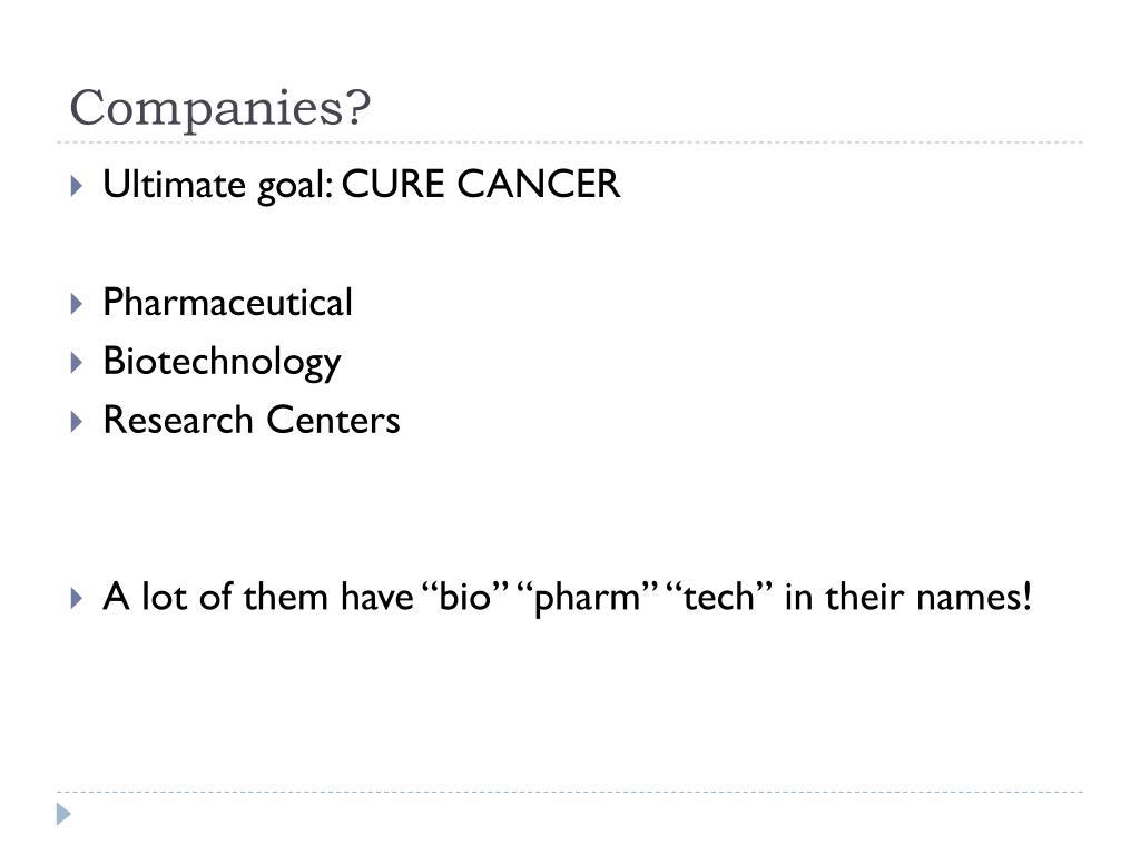 Companies? • Ultimate goal: CURE CANCER • Pharmaceutical • Biotechnology • Research Centers • A lot of them have “bio” “pharm” “tech” in their names!
