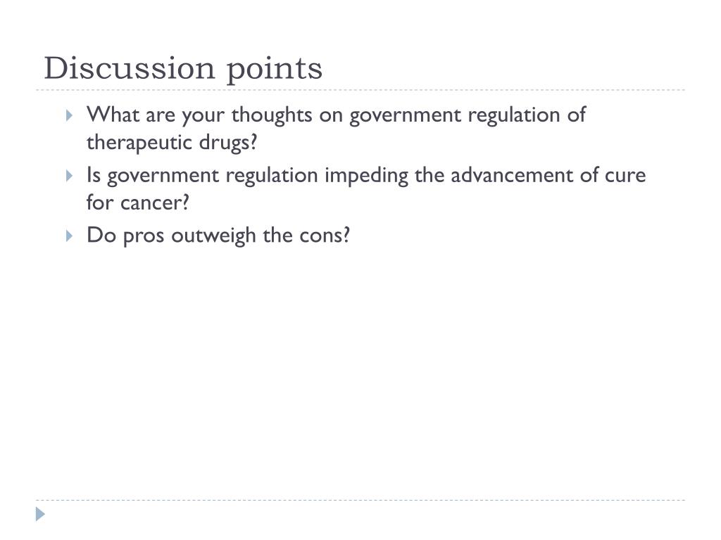 Discussion points • What are your thoughts on government regulation of therapeutic drugs? • Is government regulation impeding the advancement of cure for cancer? • Do pros outweigh the cons?