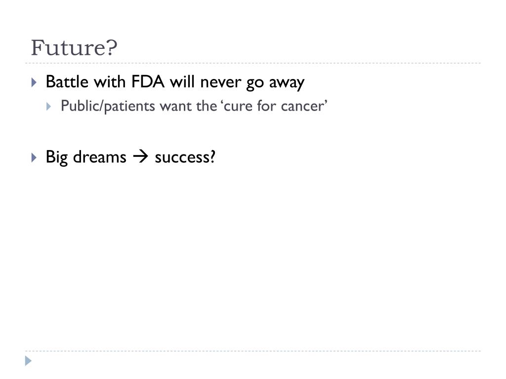 Future? • Battle with FDA will never go away • Public/patients want the ‘cure for cancer’ • Big dreams success?