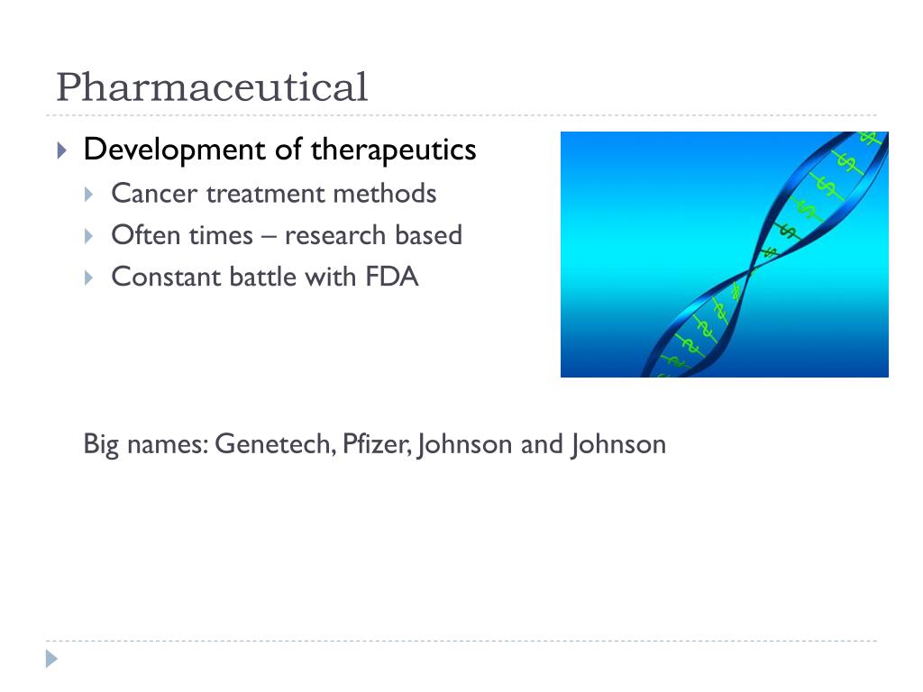 Pharmaceutical • Development of therapeutics • Cancer treatment methods • Often times – research based • Constant battle with FDA Big names: Genetech, Pfizer, Johnson and Johnson