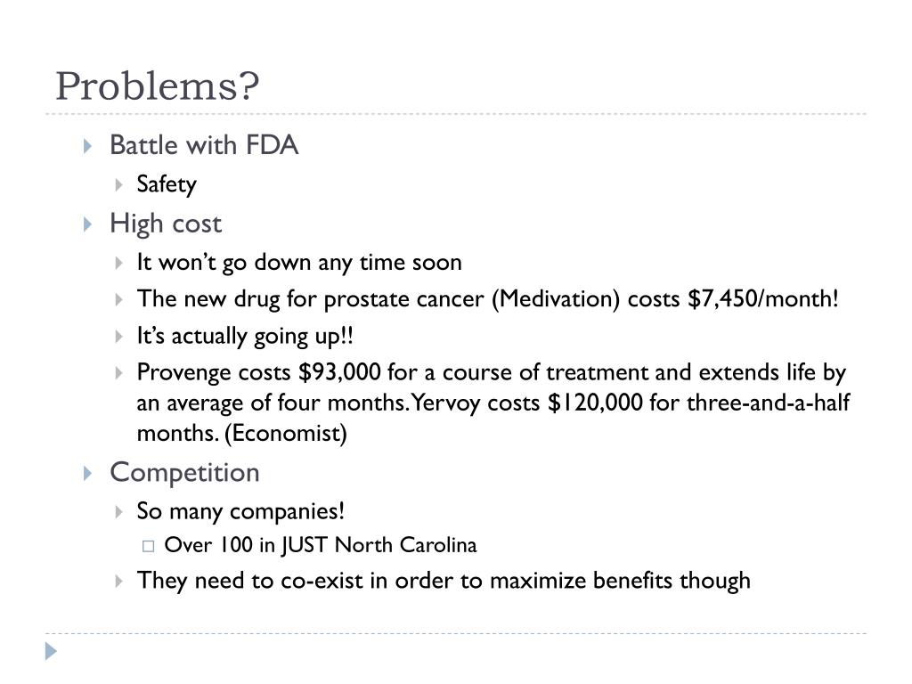 Problems? • Battle with FDA • Safety • High cost • It won’t go down any time soon • The new drug for prostate cancer (Medivation) costs $7,450/month! • It’s actually going up!! • Provenge costs $93,000 for a course of treatment and extends life by an average of four months. Yervoy costs $120,000 for three-and-a-half months. (Economist) • Competition • So many companies! • Over 100 in JUST North Carolina • They need to co-exist in order to maximize benefits though