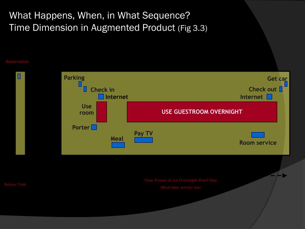 What Happens, When, in What Sequence? Time Dimension in Augmented Product (Fig 3.3) Reservation internet Parking Get car Check out Check in Internet Internet Use room USE GUESTROOM OVERNIGHT Porter Pay TV Meal Room service Time Frame of An Overnight Hotel Stay (Real-time service use) Before Visit
