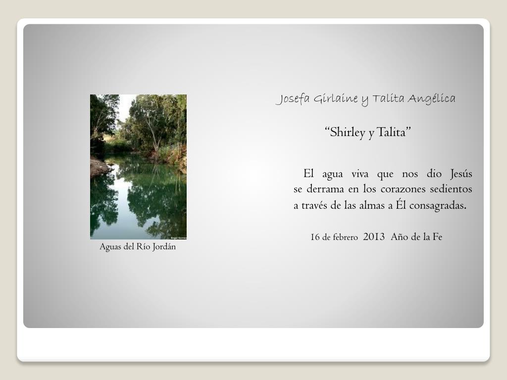 Josefa Girlaine y Talita Angélica “Shirley y Talita” El agua viva que nos dio Jesússe derrama en los corazones sedientos a través de las almas a Él consagradas. 16 de febrero 2013 Año de la Fe Aguas del Río Jordán