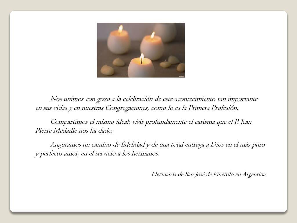 Nos unimos con gozo a la celebración de este acontecimiento tan importante en sus vidas y en nuestras Congregaciones, como lo es la Primera Profesión. • Compartimos el mismo ideal: vivir profundamente el carisma que el P. Jean Pierre Mèdaille nos ha dado. • Auguramos un camino de fidelidad y de una total entrega a Dios en el más puro y perfecto amor, en el servicio a los hermanos. • Hermanas de San José de Pinerolo en Argentina