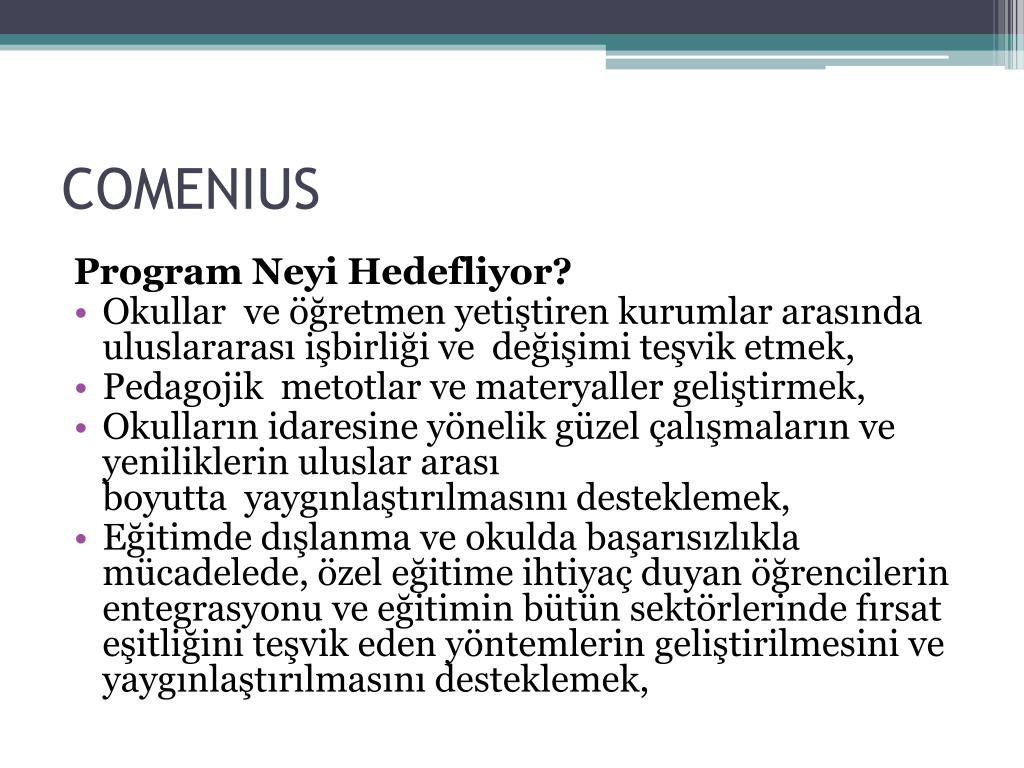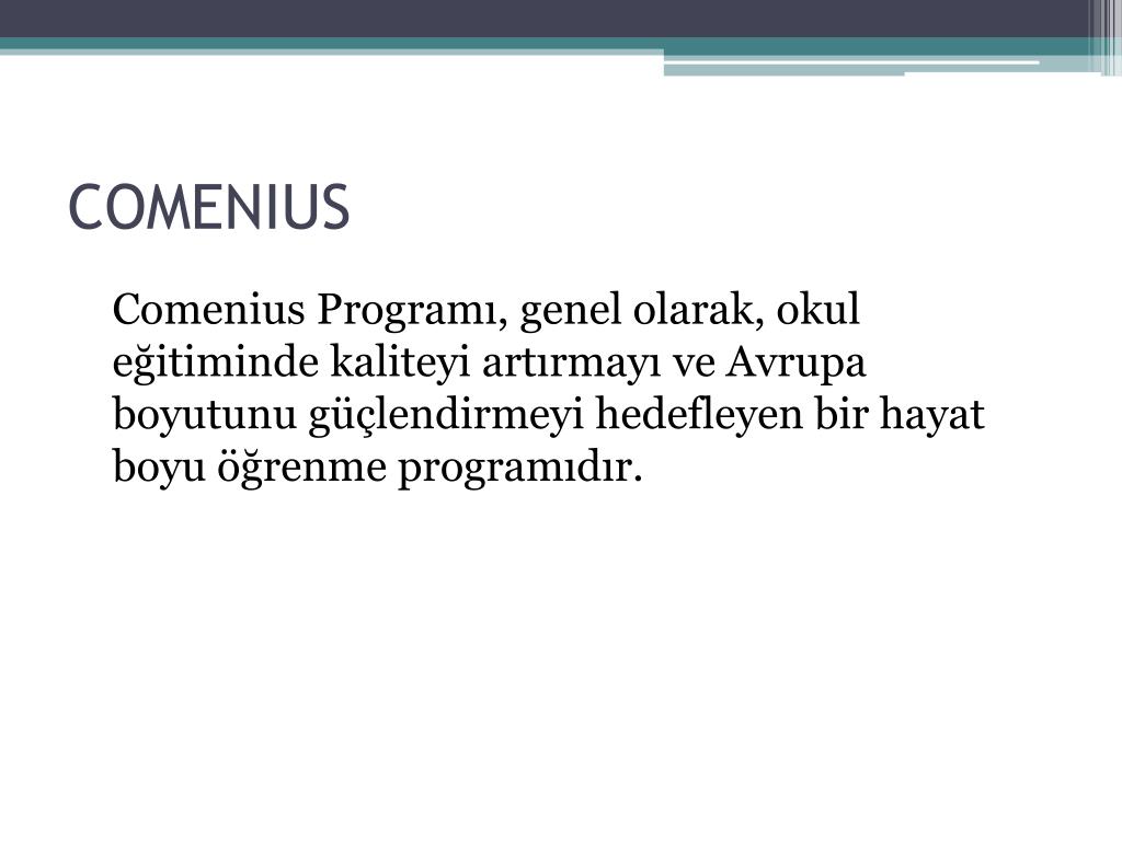 COMENIUS ComeniusProgramı, öğrenciler ve eğitim personeli arasında Avrupa kültür ve dil çeşitliliği ile değerleri hakkında bilgi ve anlayış oluşturmayı, iş birliğini güçlendirmeyi, aktif bir Avrupa vatandaşı olma yolunda öğrencilerin kişisel gelişimleri için gerekli olan temel becerileri ve yeterlilikleri edinmelerini amaçlamaktadır. Programa dahil ülkeler 27 AB üyesi ülke, Norveç, Lihtenştayn, İzlanda, Hırvatistan, İsviçre ve Türkiye’dir.